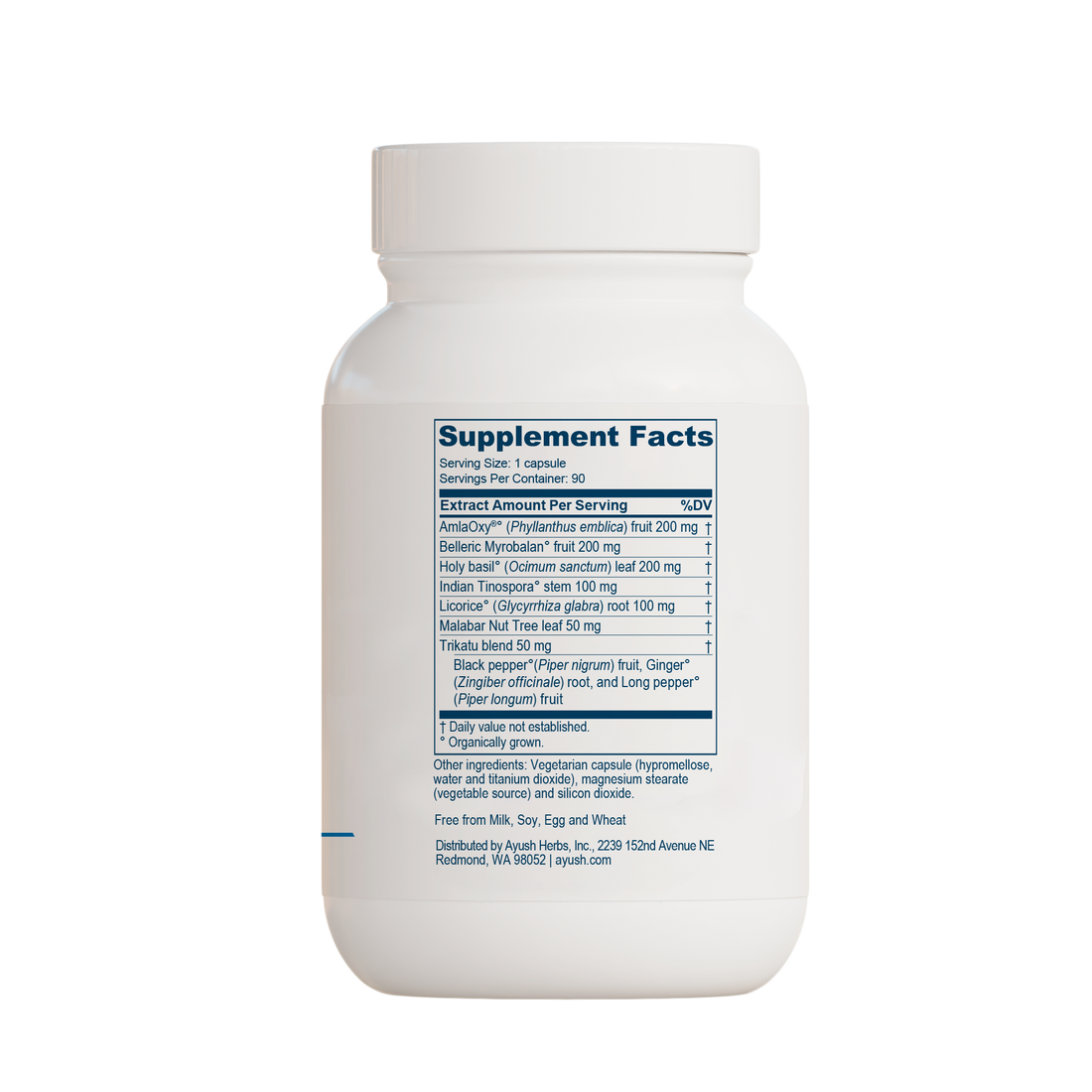 Flucomune is a unique blend of botanicals designed to support a healthy and responsive immune system.* It combines amla, holy basil, guduchi, licorice root, and vasaka leaf for a truly holistic botanical immune support.