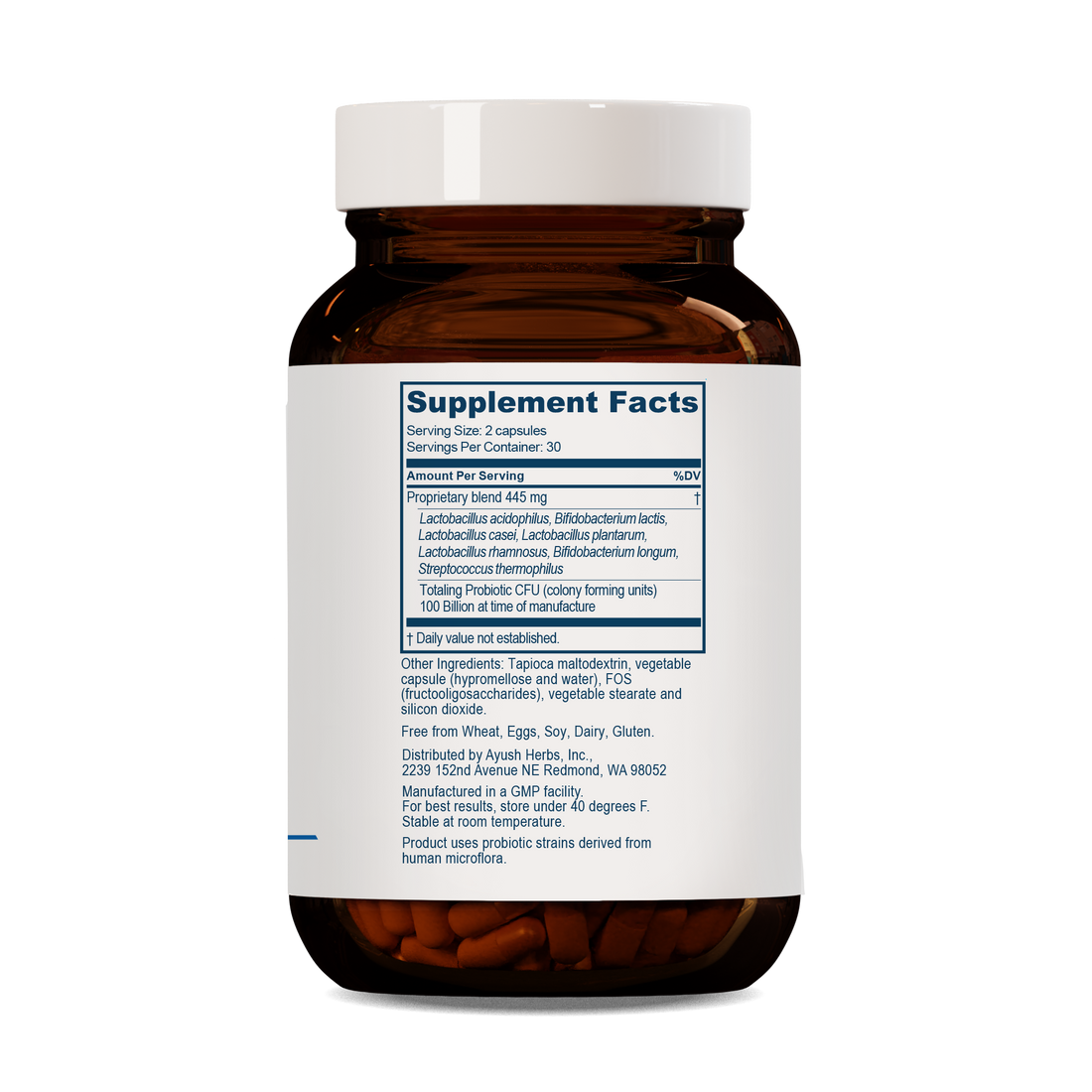 The research into the human microbiome has demonstrated the far reaching and systemic effects that the microbiome plays in human health. Probiotic 100B has been formulated using seven of the most researched strains that offer the most benefit in promoting health in the human body. Additionally, the addition of prebiotic fructooligosaccharides (FOS) supports probiotic colonization and maintenance and give synbiotic benefits including immune support, and supporting healthy digestion.* This probiotic is third-party tested for purity and potency and is shelf-stable for two years at room temperature. It is delivered in an eco-friendly vegetarian capsule.