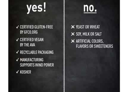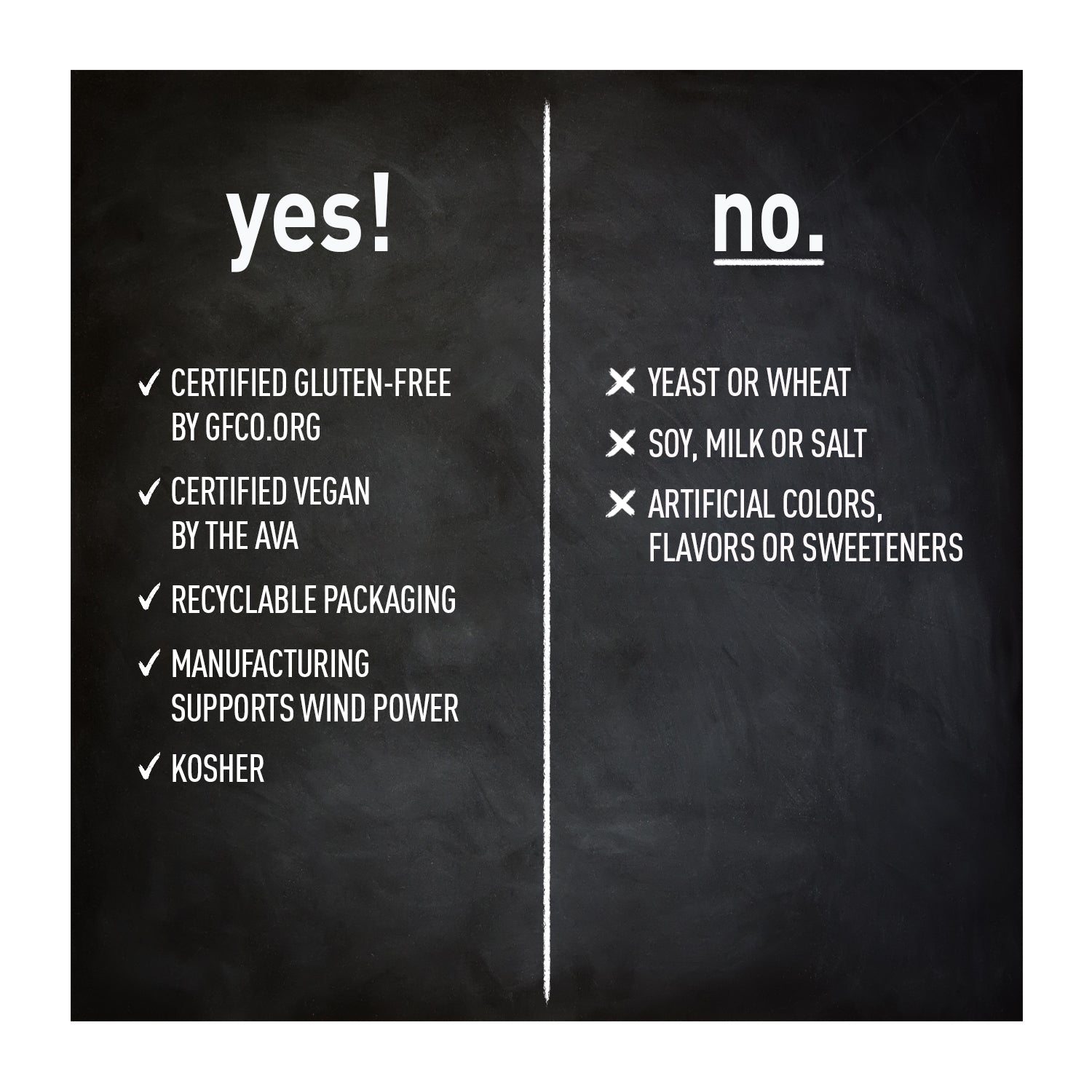 Highlights: Gluten Free, Vegan, Recyclable Packaging, Kosher, Wheat Free, Yeast Free, Soy Free, Milk Free, Salt Free, No Artificial Colors, No Artificial Flavors, No Artificial Sweeteners