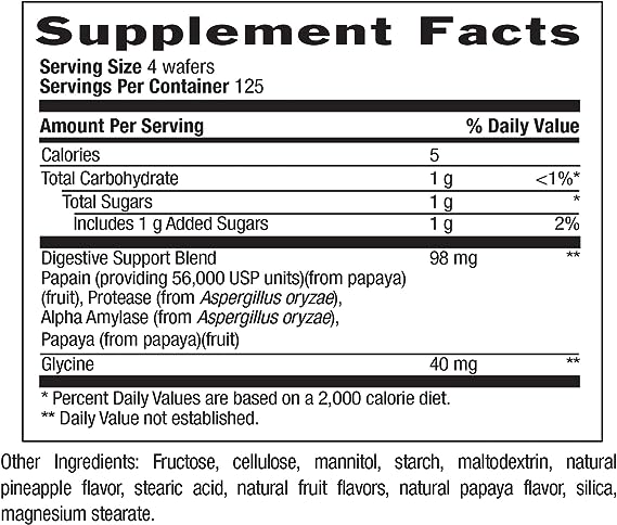 | Other ingredients:Fructose, cellulose, mannitol, starch, maltodextrin, natural pineapple flavor, stearic acid, natural fruit flavors, natural papaya flavor, silica, magnesium stearate. |