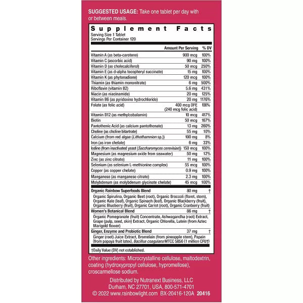 Made with blends of superfoods, probiotics and ashwagandha, Women's One contains high-potency amounts of 19 vitamins and minerals so you get at least 100% of the recommended daily values. Just one tablet nourishes your whole body—from brain to heart to metabolism. So cross feeling GOOD off your to-do list with Rainbow Light Women’s One Multivitamin, a once-daily supplement that supports your whole health from head to toe.*