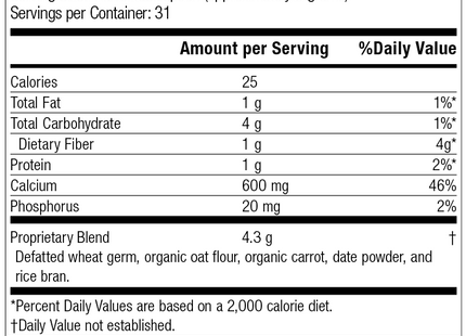 Each Serving Size (1 level tablespoon) contains: Calories 25, Total Fat 1 g, Total Carbohydrate 4 g, Dietary Fiber 1 g, Protein 1 g, Calcium 600 mg, Phosphorus 20 mg. Proprietary Blend 4.3 g: Defatted wheat germ, organic oat flour, organic carrot, date powder, and rice bran. Other Ingredients: Bovine bone and veal bone. Contains: Wheat.