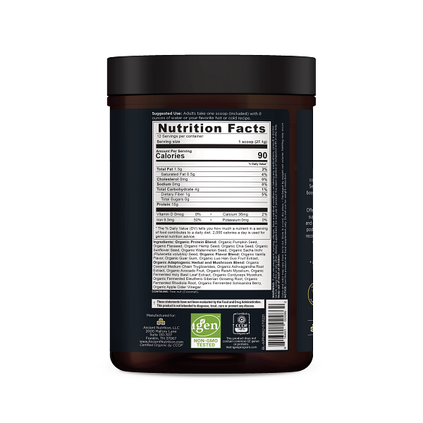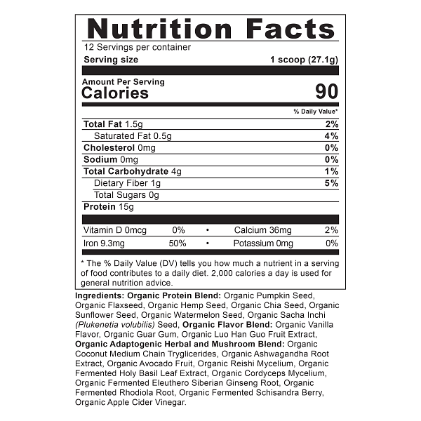 Organic Protein Blend: Organic Pumpkin Seed Protein, Organic Flaxseed Meal, Organic Hemp (seed) Protein, Organic Chia (seed) Protein, Organic Sunflower (seed) Protein, Organic Watermelon (seed) Protein, Organic Plukenetia volubilis (Sacha Inchi) (seed) Protein